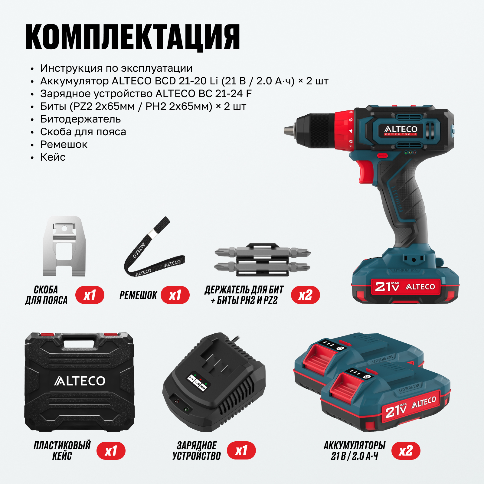 - Аккумулятор ALTECO BCD 21-20 Li (21 В / 2.0 А·ч) × 2 шт