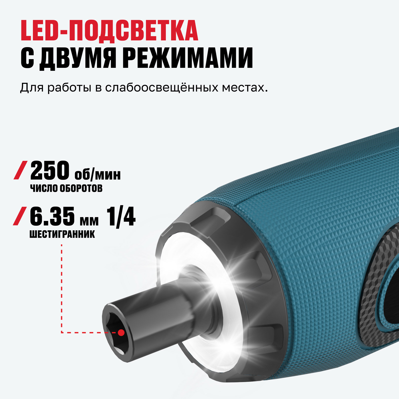 - LED-подсветка с двумя режимами — для работы в слабоосвещённых местах.