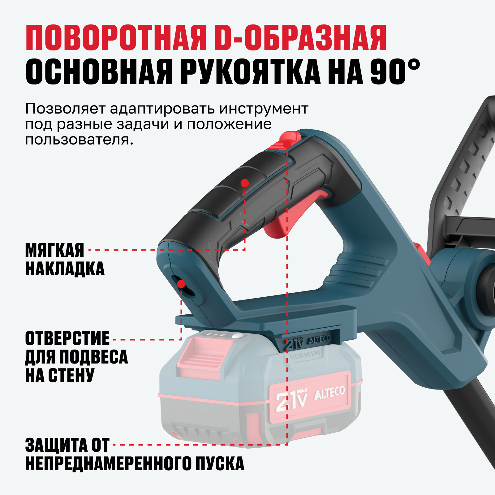 - Поворотная D-образная основная рукоятка на 90° с мягкой накладкой — позволяет адаптировать инструмент под разные задачи и положение пользователя.