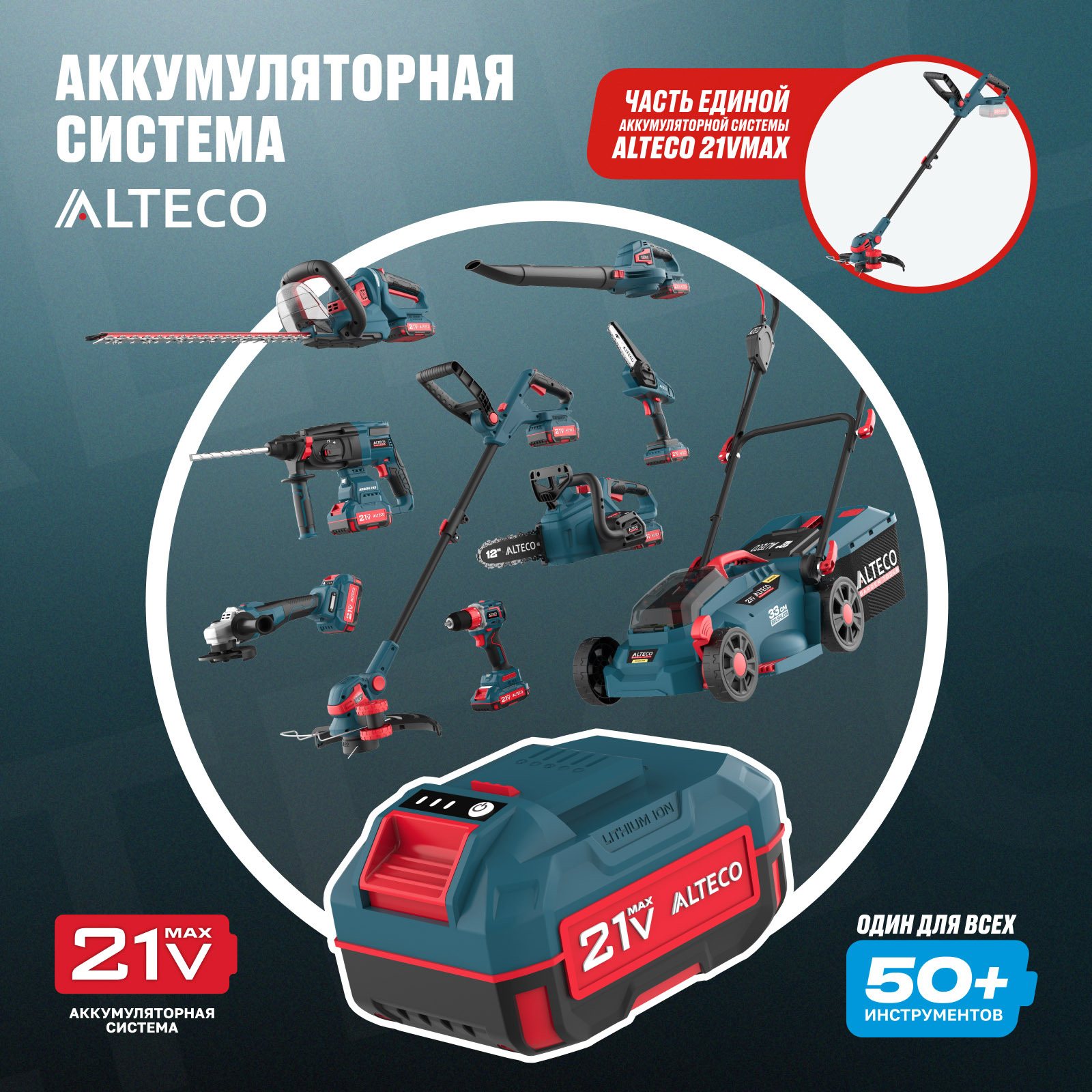 - Часть единой аккумуляторной системы ALTECO 21Vmax — один аккумулятор подходит для всех инструментов этой серии, обеспечивая удобство, экономию и гибкость в работе.
