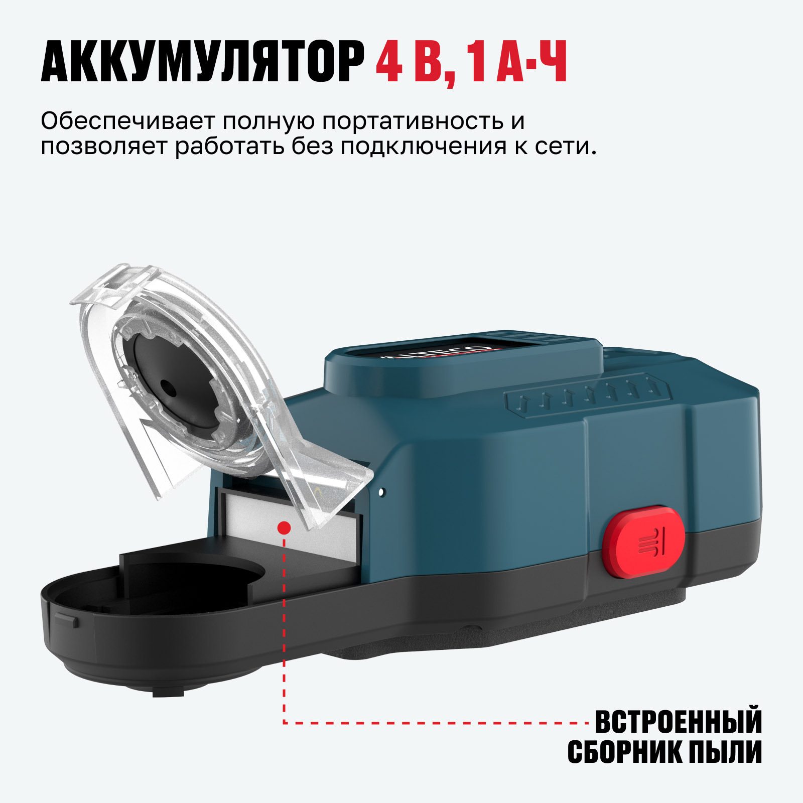 - Аккумулятор 4 В, 1 А·ч — обеспечивает полную портативность и позволяет работать без подключения к сети.