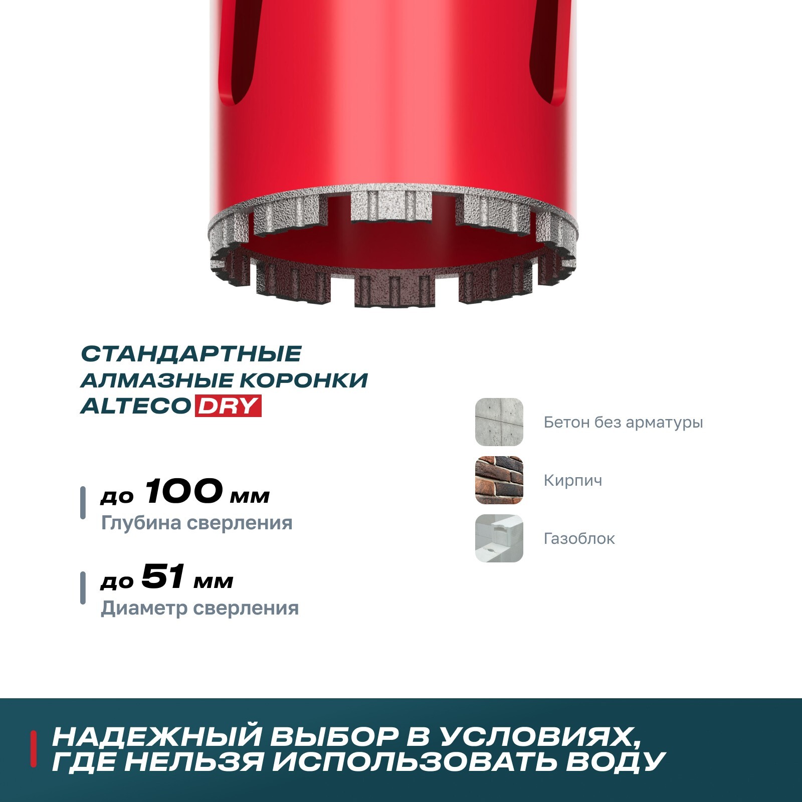 - Идеальны для сухого сверления бетона и кирпича, особенно в условиях, где использование воды невозможно. Боковые отверстия эффективно охлаждают инструмент и удаляют шлак, продлевая срок службы и обеспечивая безопасность.