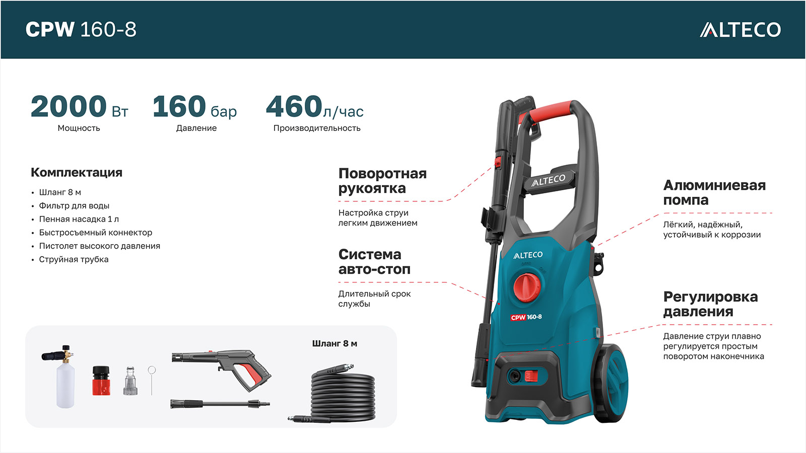 - Алюминиевая помпа — повышает надежность и стойкость аппарата.