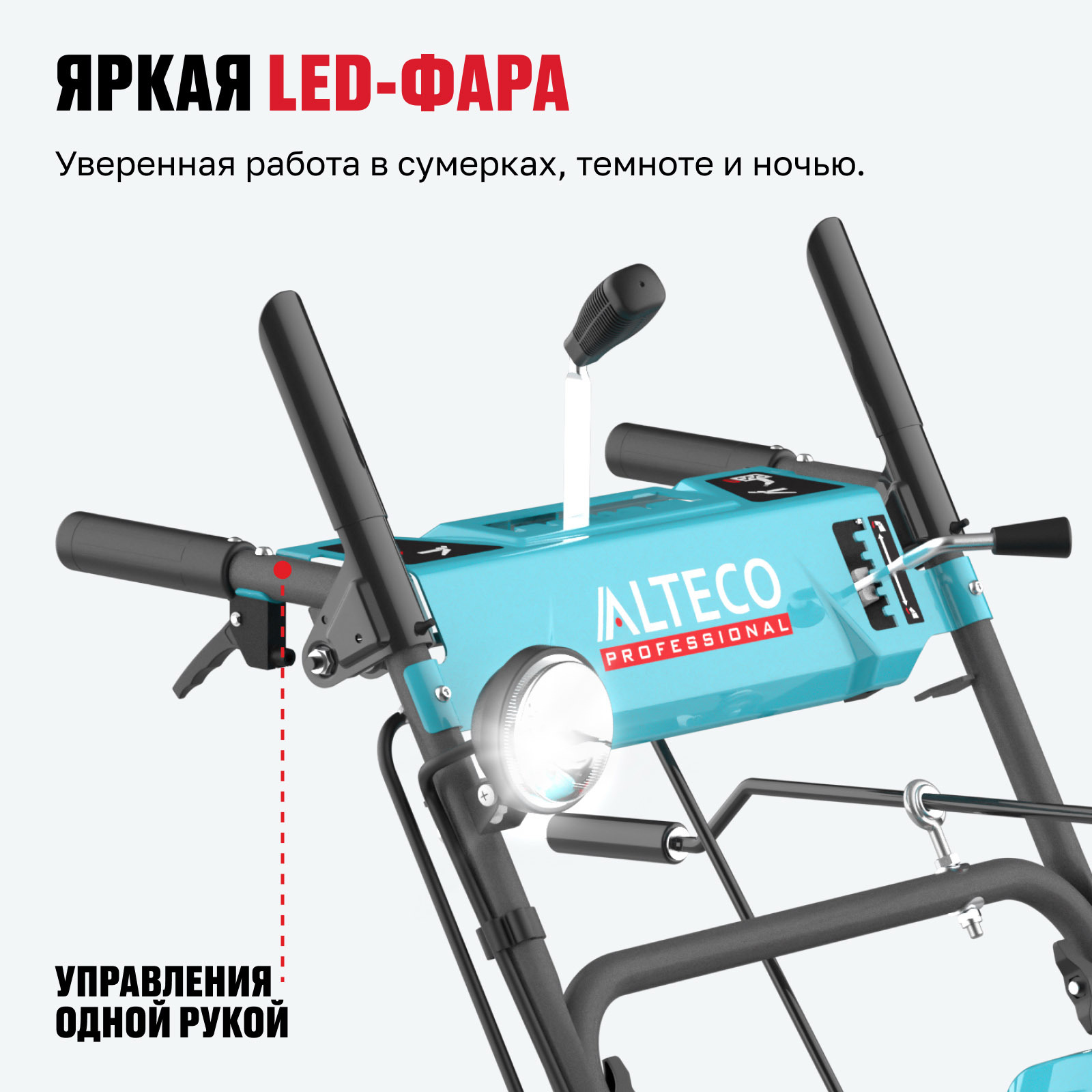 - Яркая LED-фара — уверенная работа в сумерках, темноте и ночью.