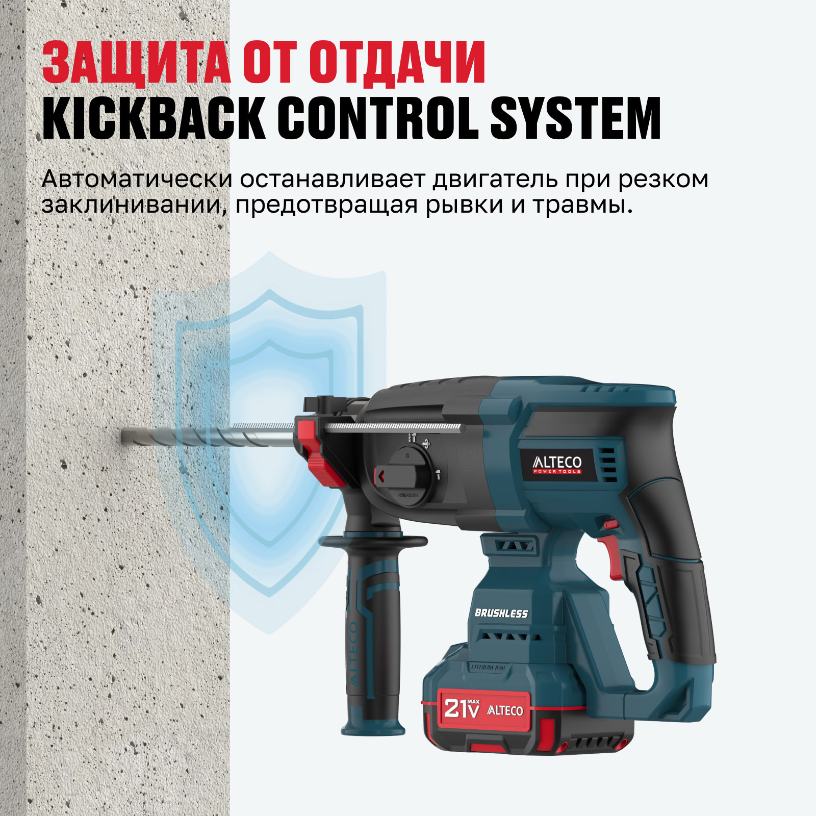 - Система Kickback Control — автоматически отключает инструмент при заклинивании, предотвращая отдачу.