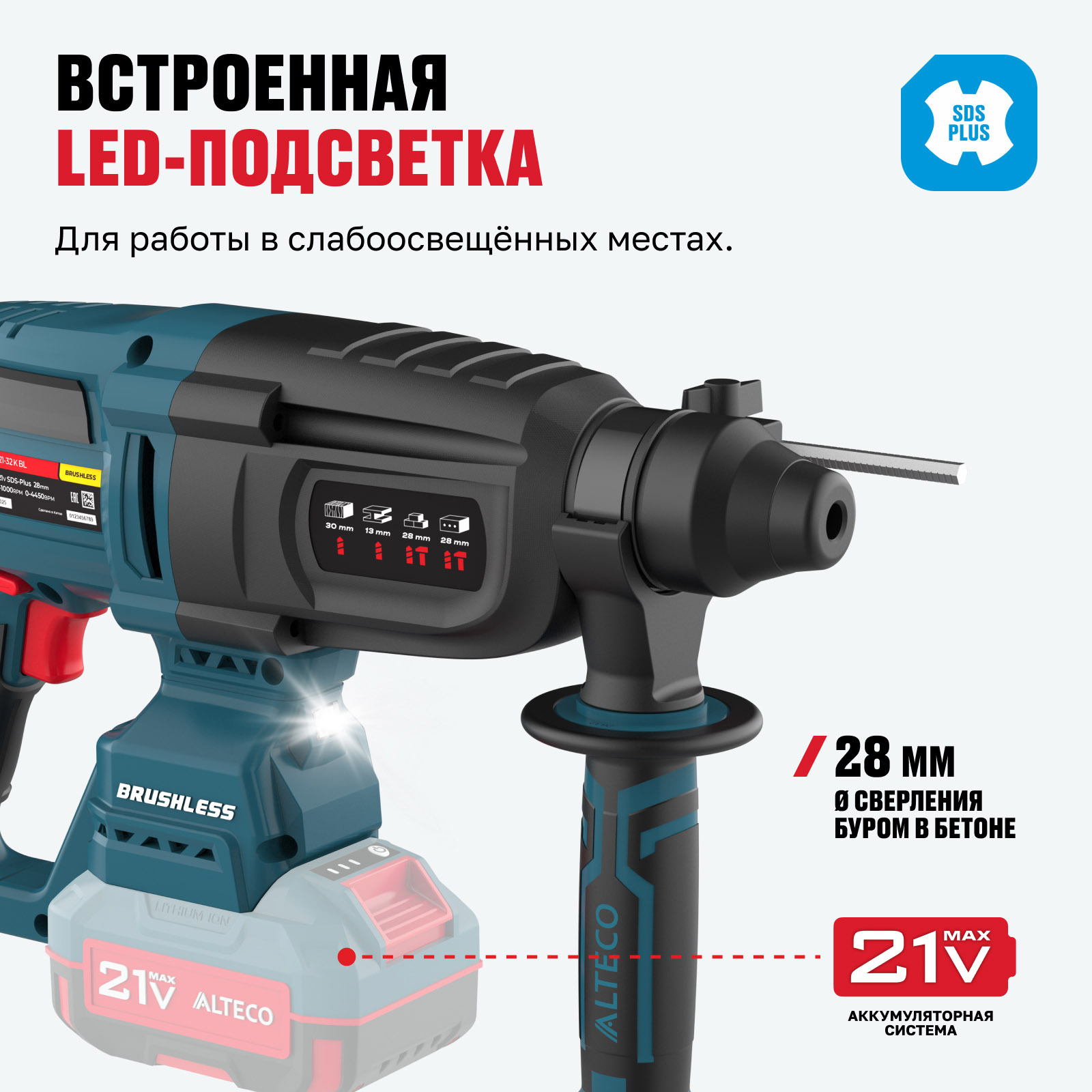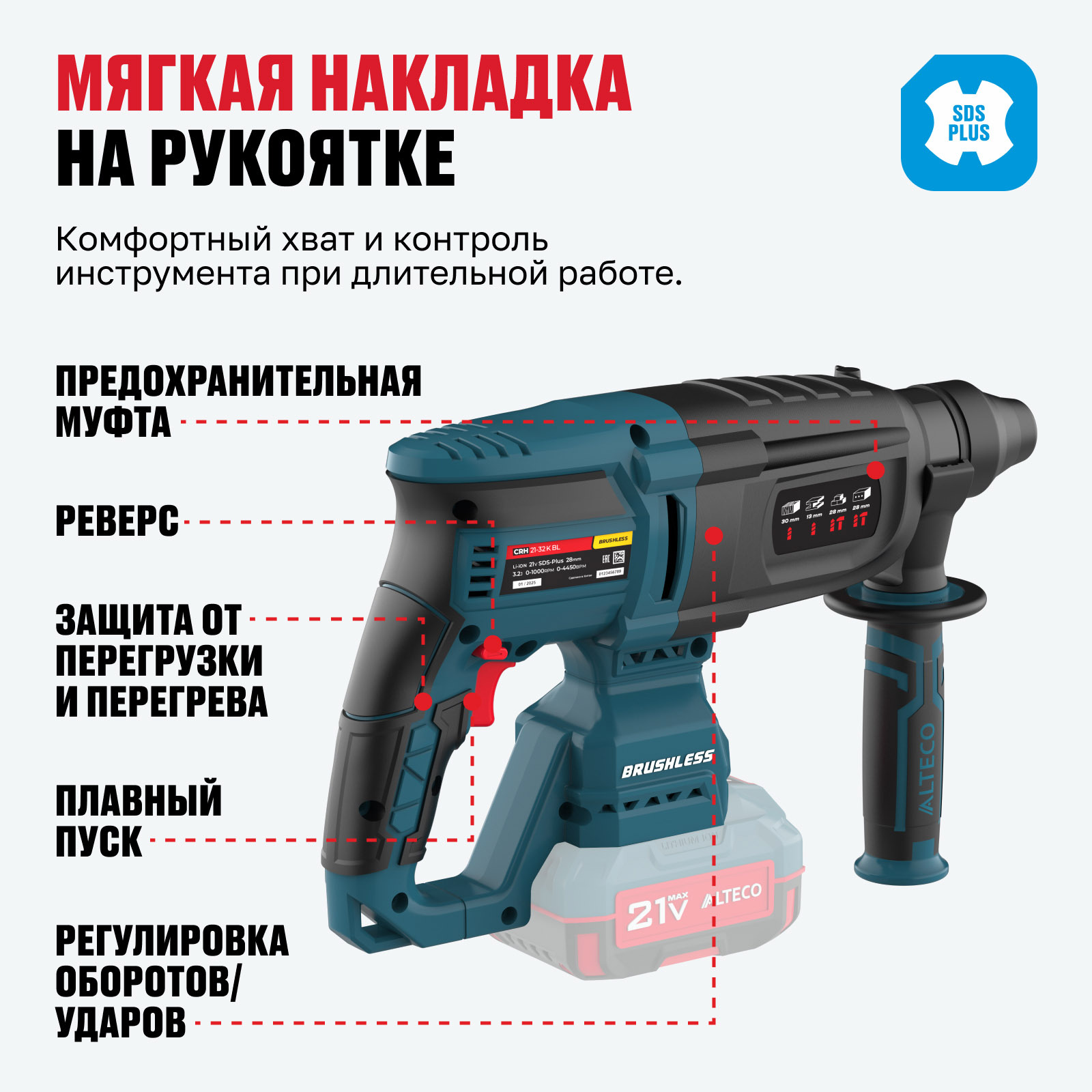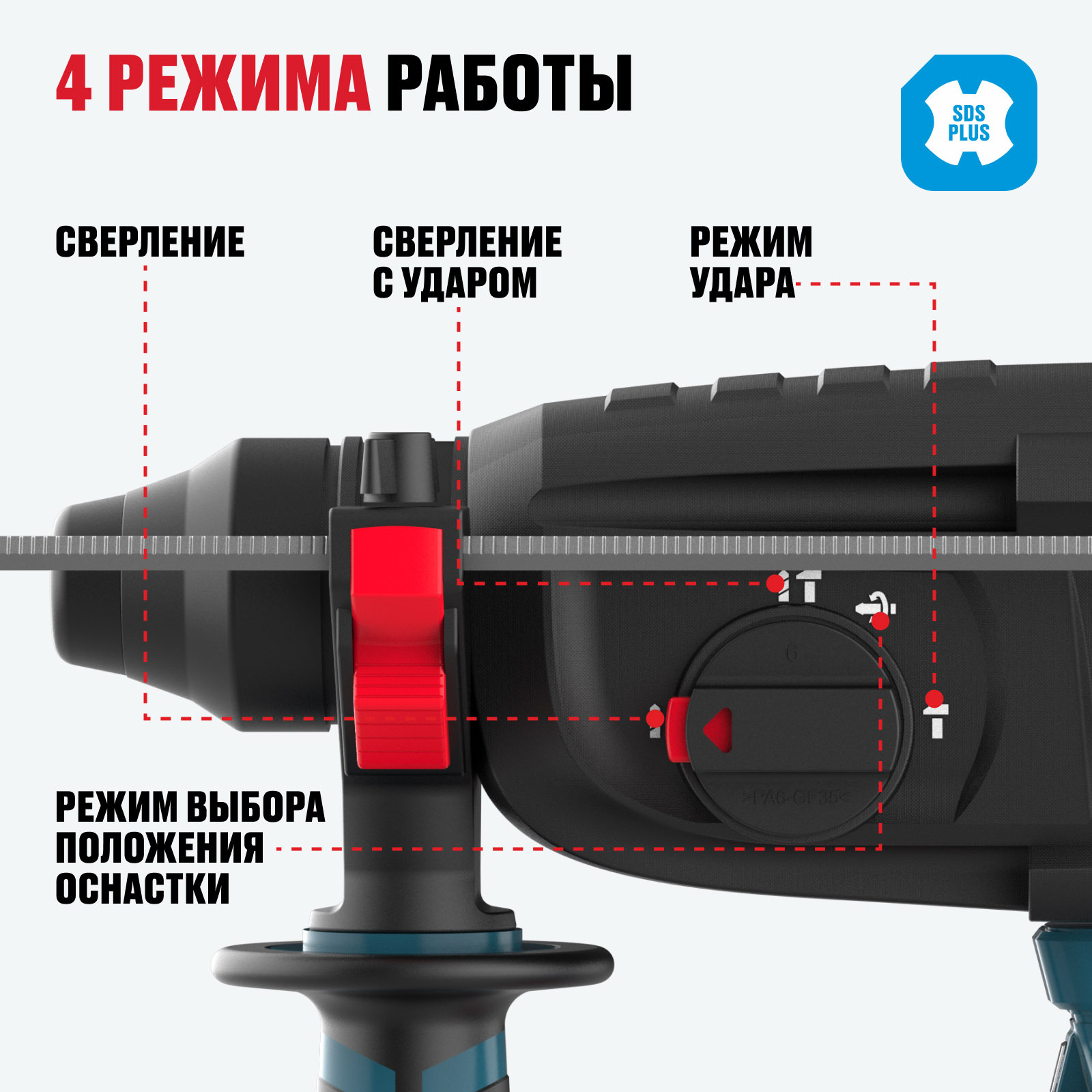 - Патрон SDS-Plus — быстрая и удобная замена оснастки без инструментов.