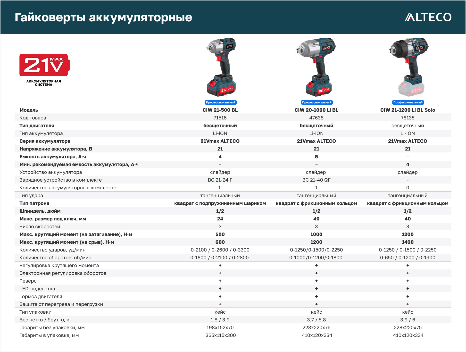 - Часть единой аккумуляторной системы ALTECO 21Vmax — один аккумулятор подходит для всех инструментов этой серии, обеспечивая удобство, экономию и гибкость в работе.