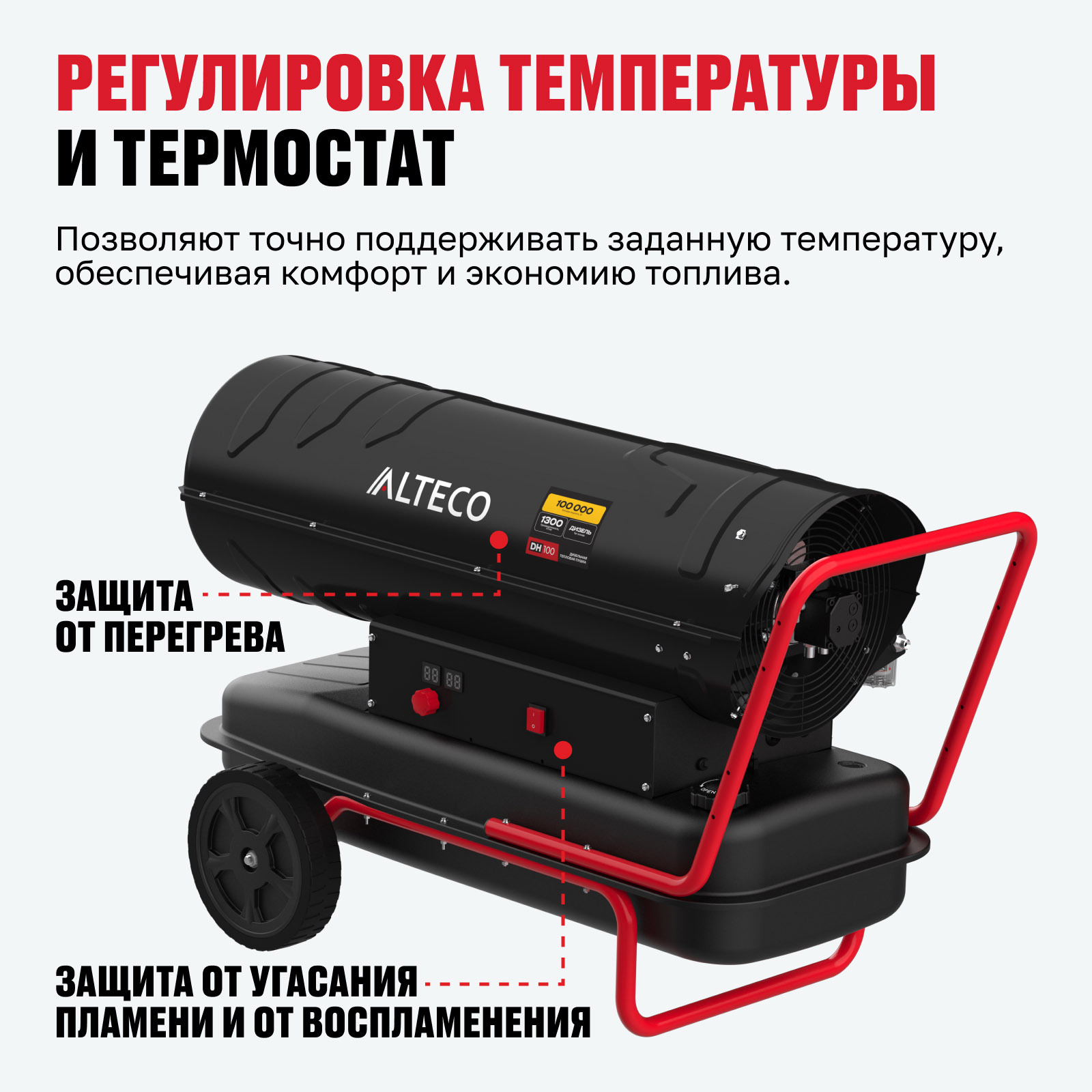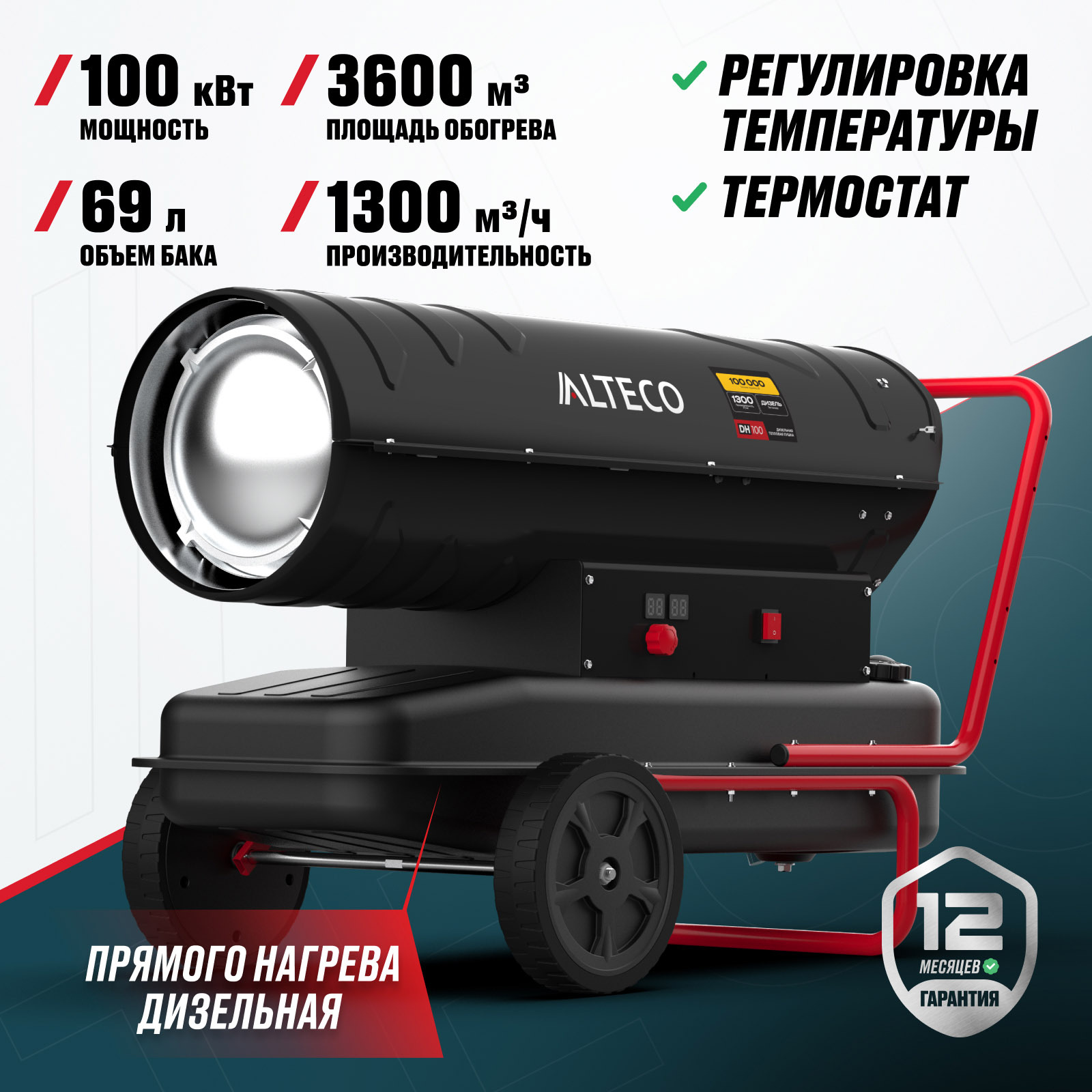 - Высокая мощность обогрева 100 кВт — обеспечивает быстрый прогрев воздуха и стабильную температуру на площади до 3600 м³ при производительности 1300 м³/ч.