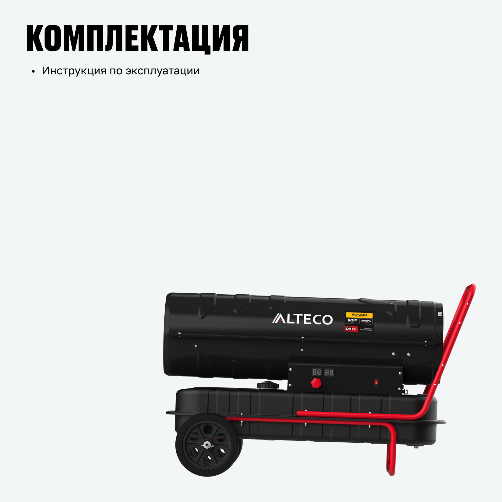 - Высокая мощность обогрева 60 кВт — обеспечивает быстрый прогрев воздуха и стабильную температуру на площади до 2400 м³ при производительности 1200 м³/ч.