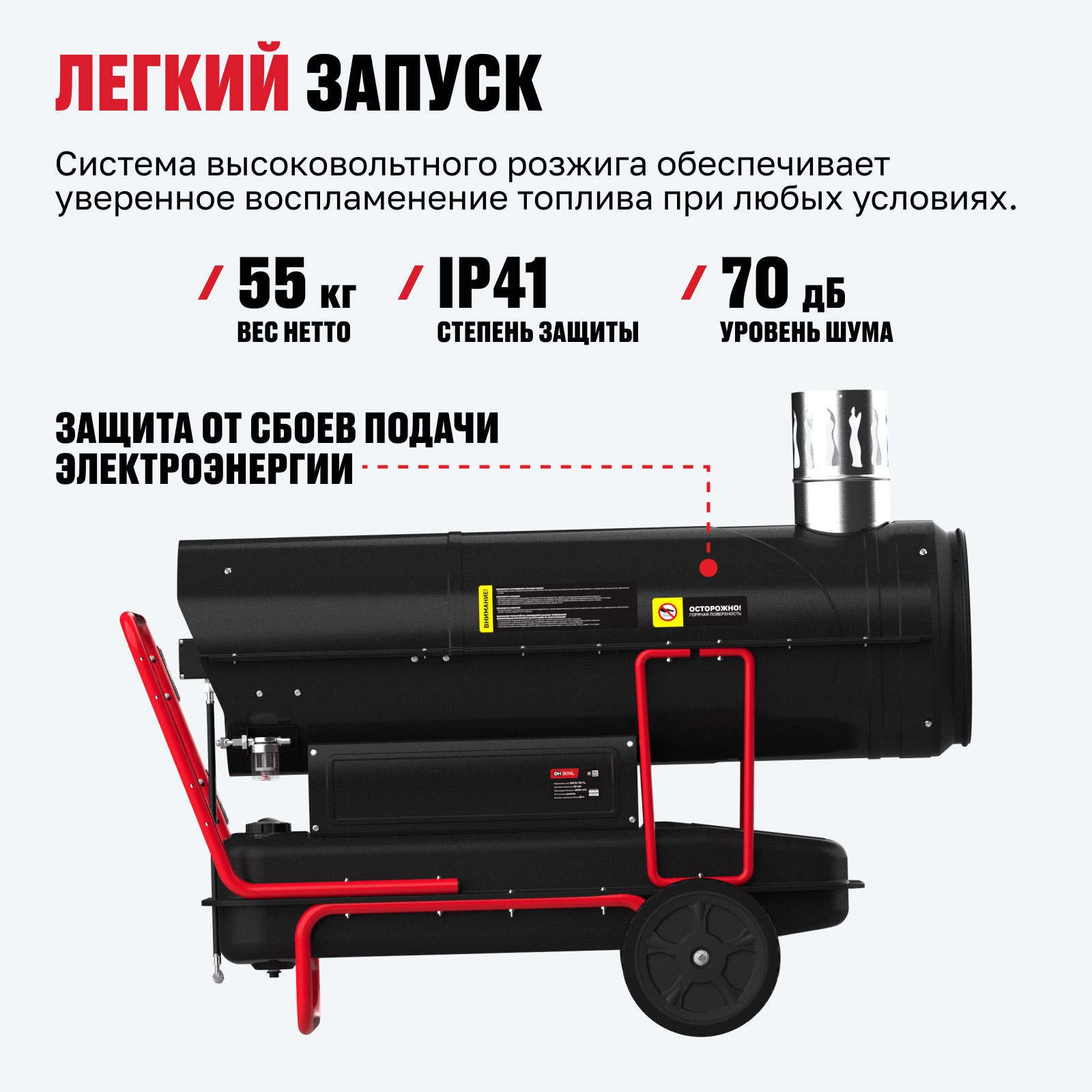 - Высокая мощность обогрева 50 кВт — обеспечивает быстрый прогрев воздуха и стабильную температуру на площади до 2250 м³ при производительности 2000 м³/ч.
