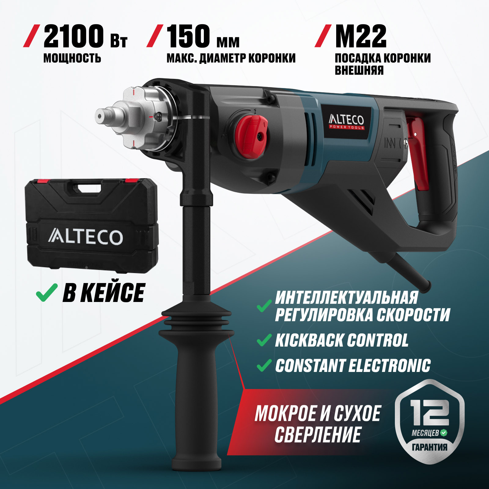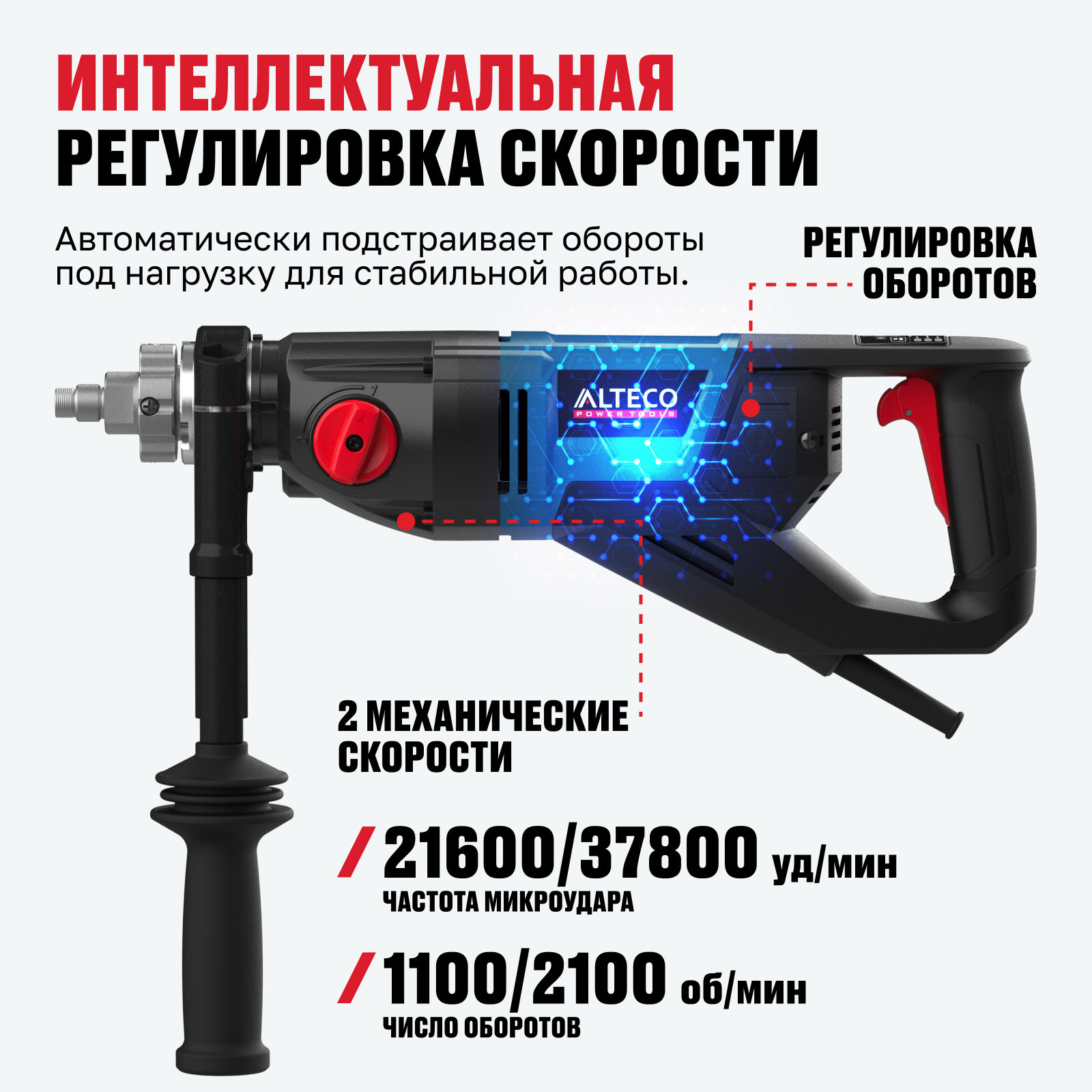 - Антивибрационная рукоятка в 12 положениях — снижает нагрузку на руки, повышая комфорт и точность при длительном бурении.