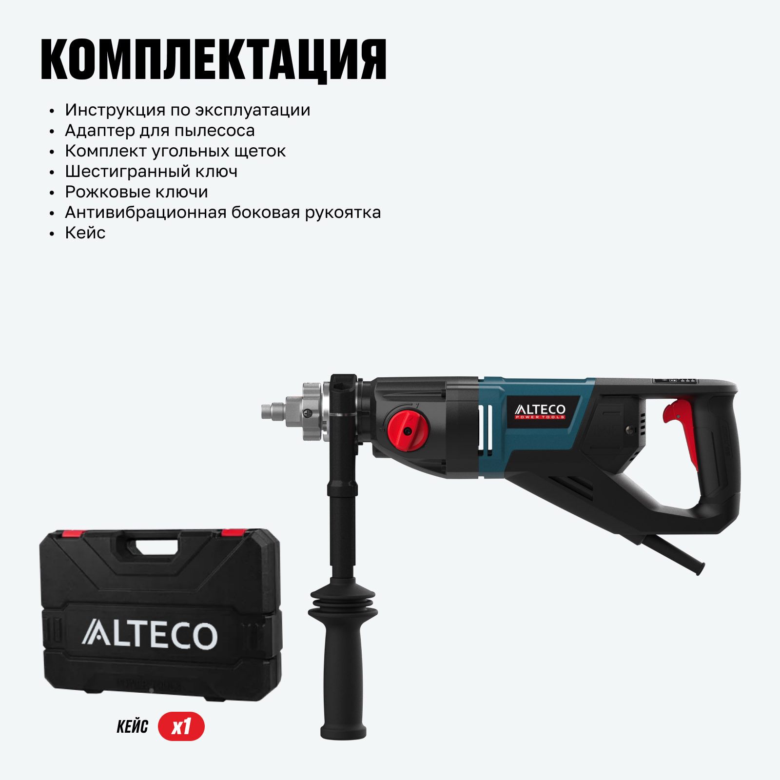 - Кейс в комплекте — прочный и удобный для транспортировки и хранения инструмента и аксессуаров.