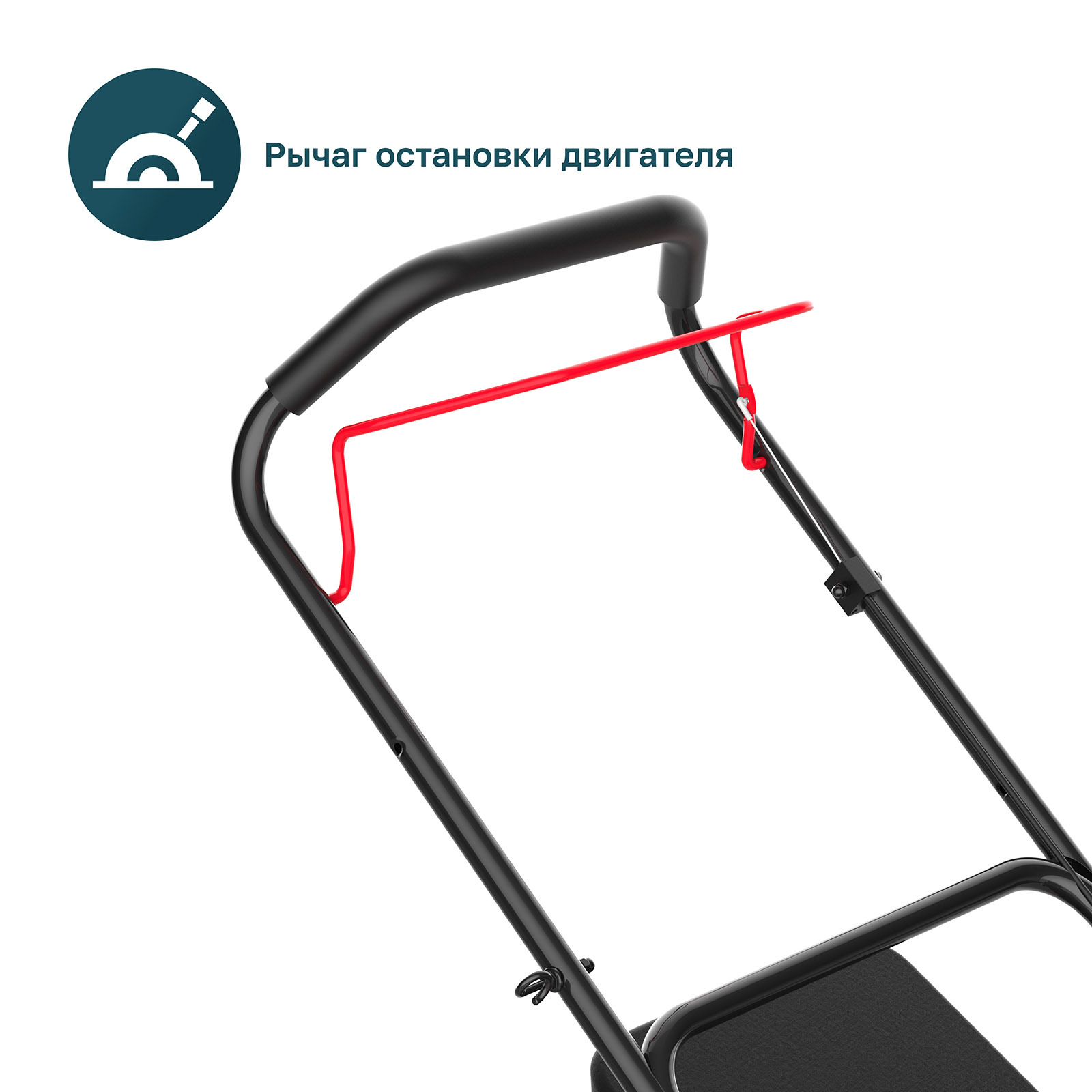- Задний выброс травы – обеспечивает чистоту и удобство работы, избавляя от необходимости уборки вручную