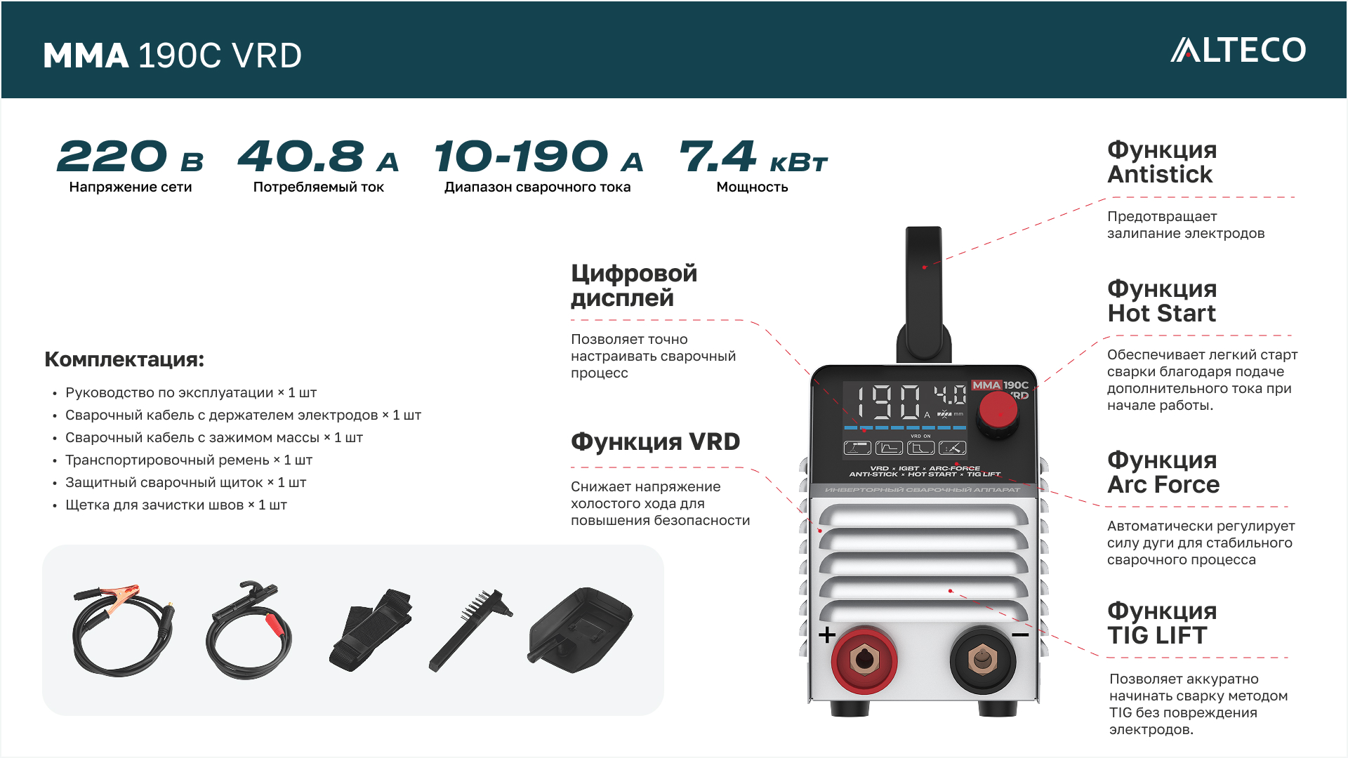 - Функция VRD – снижает напряжение холостого хода для повышения безопасности, уменьшая риск удара током во время простоя