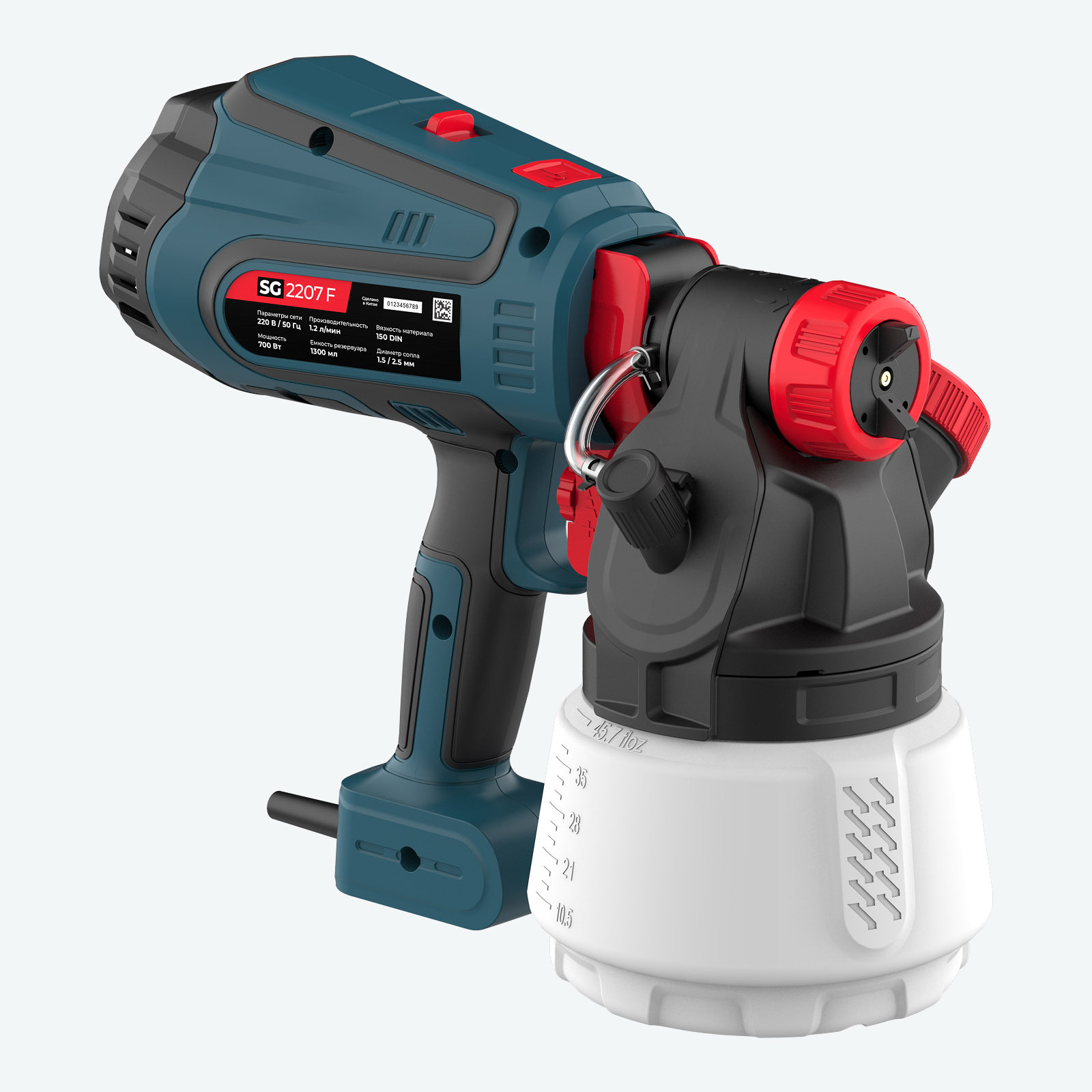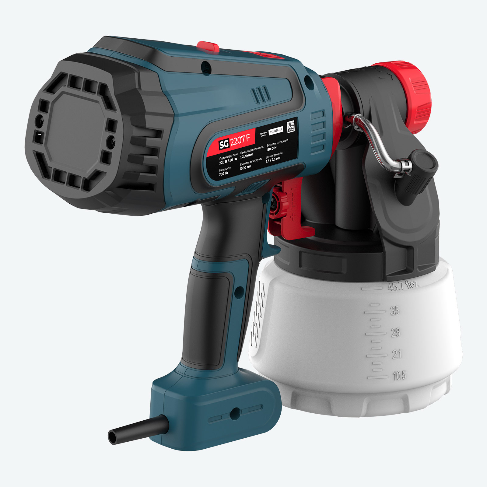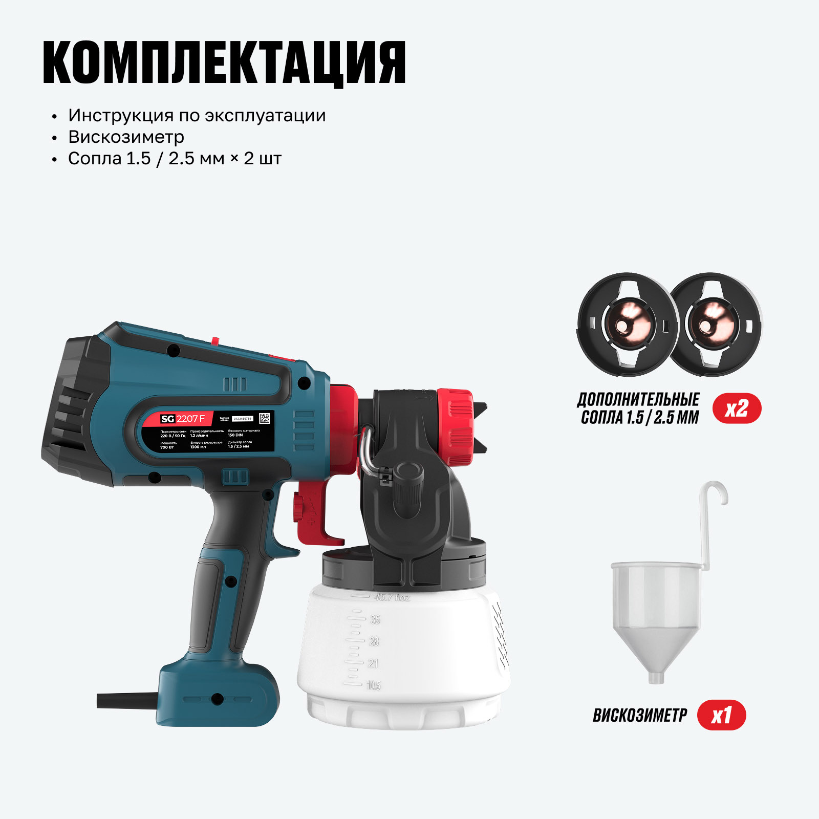 Оснащенный возможностью регулировки формы распыления, регулировкой интенсивности распыления и быстрой системой заполнения резервуара, SG 2207 F обеспечивает точность и простоту использования. Наличие сопел 1.5 мм и 2.5 мм, а также вискозиметра позволяет адаптировать его к различным типам красок и задачам.