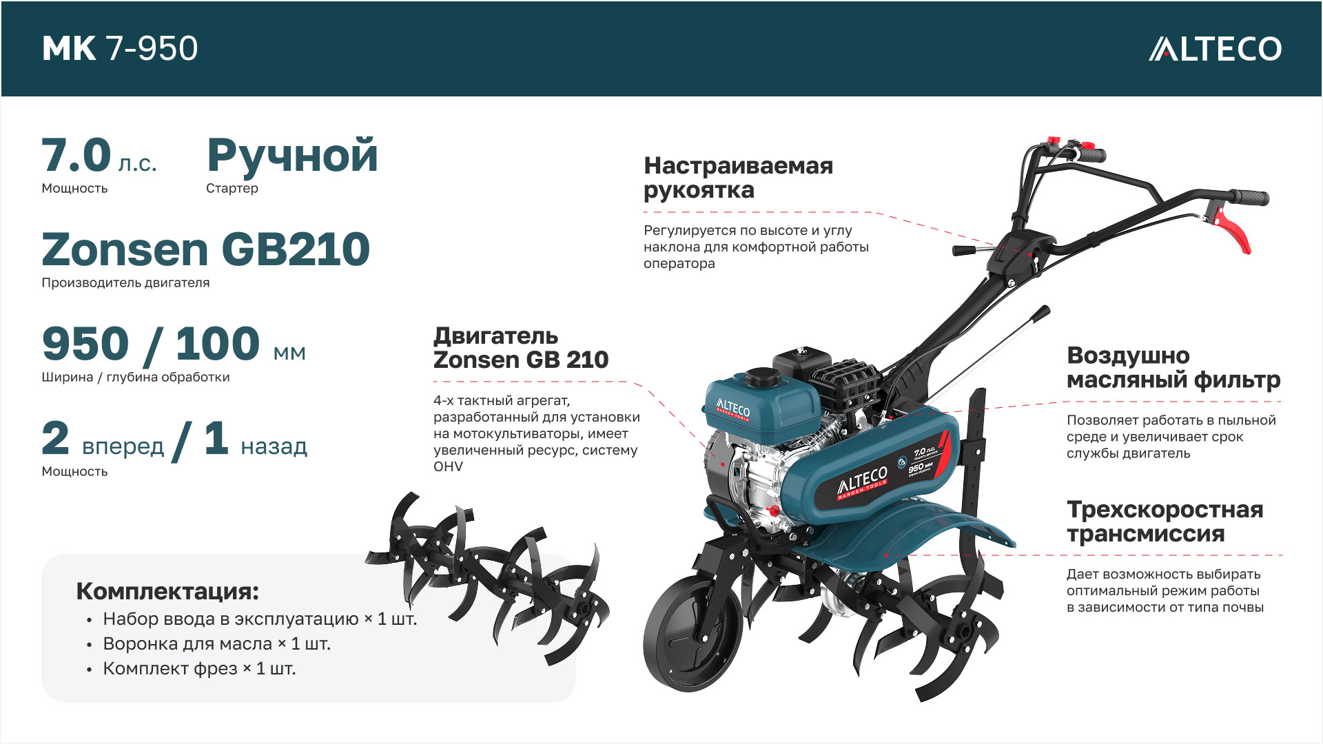 - Двигатель Zonsen GB 210 4-х тактный агрегат, разработанный для установки на мотокультиваторы, имеет увеличенный ресурс, систему OHV (верхнее расположение клапанов, улучшающее эффективность сгорания топлива и снижает выбросы)