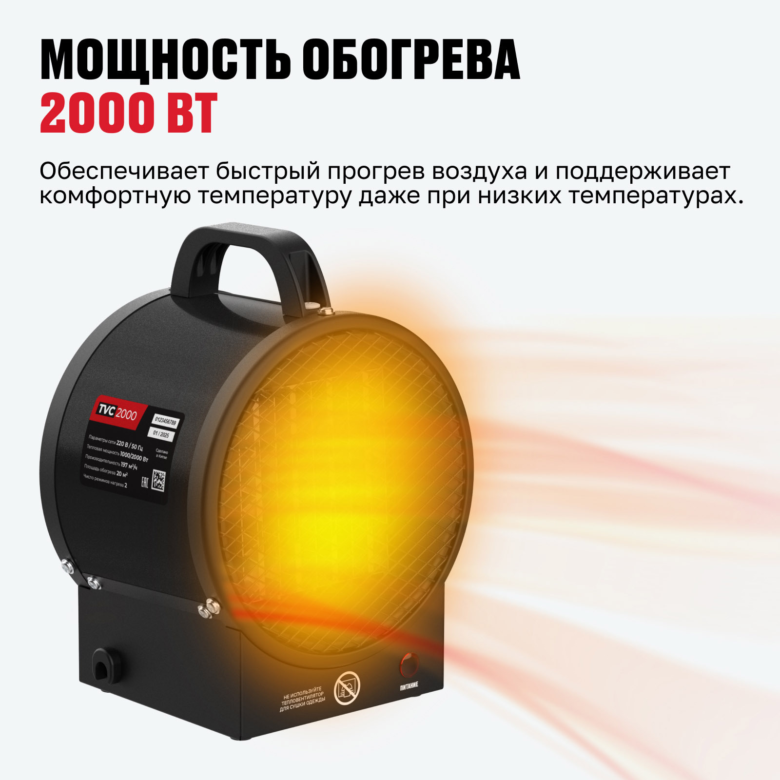 - Мощность обогрева 2000 Вт — обеспечивает быстрый прогрев воздуха и поддерживает комфортную температуру даже при низких температурах.