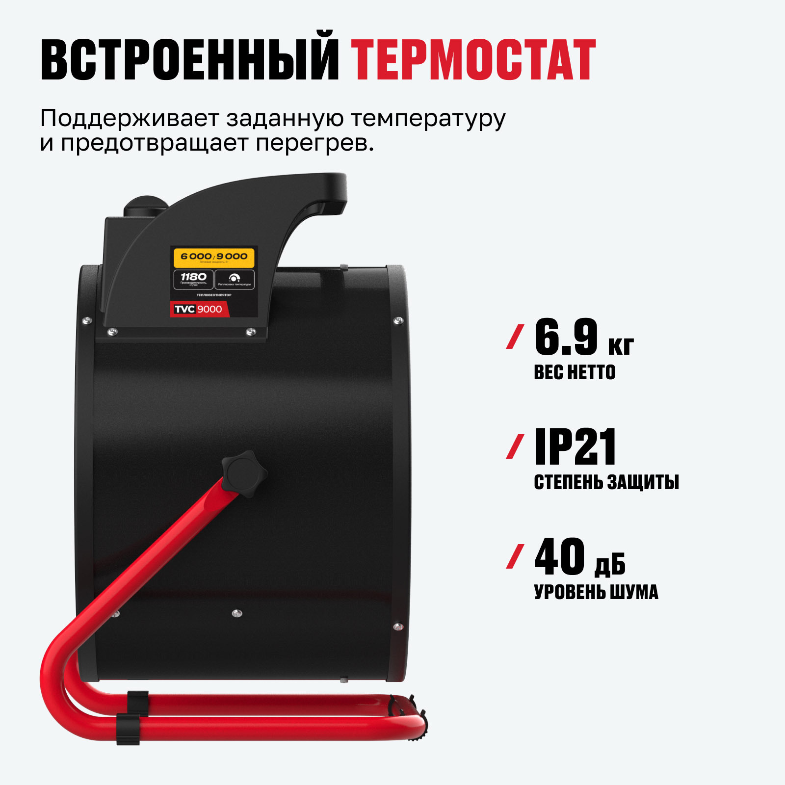 - Высокая производительность 9000 м³/ч — сильный поток воздуха равномерно распределяет тепло по помещению, ускоряя процесс обогрева.