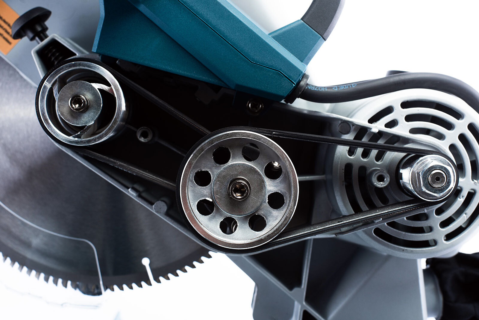 - Двухступенчатый ременной привод — компенсирует вибрацию и ударные нагрузки, что увеличивает ресурс двигателя, увеличивает крутящий момент, обеспечивает низкий уровень шума, надежность, стабильное качество распила
