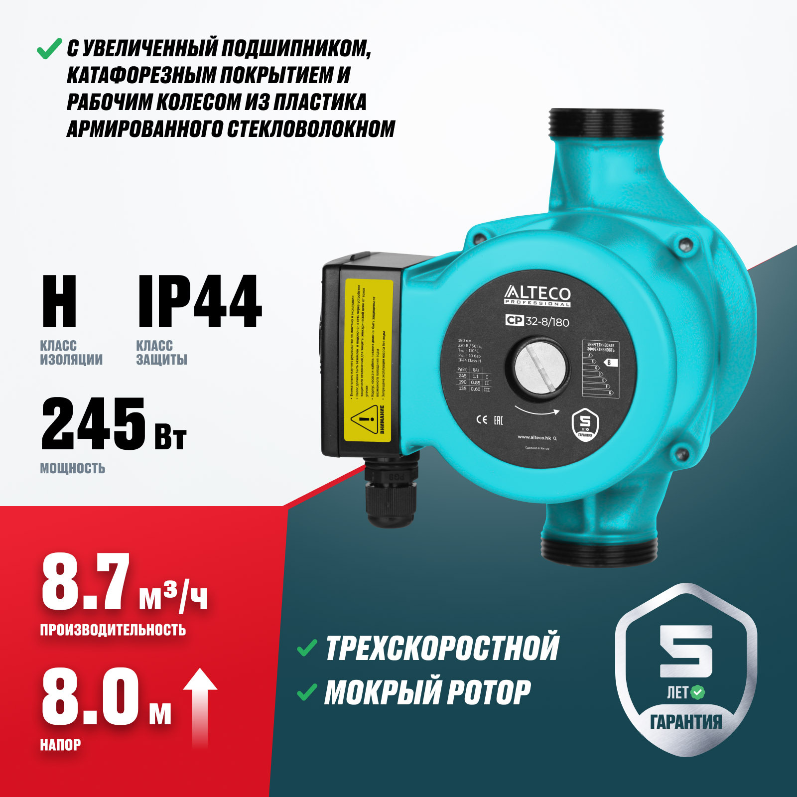 С увеличенный подшипником, катафорезным покрытием и рабочим колесом из пластика армированного стекловолокном